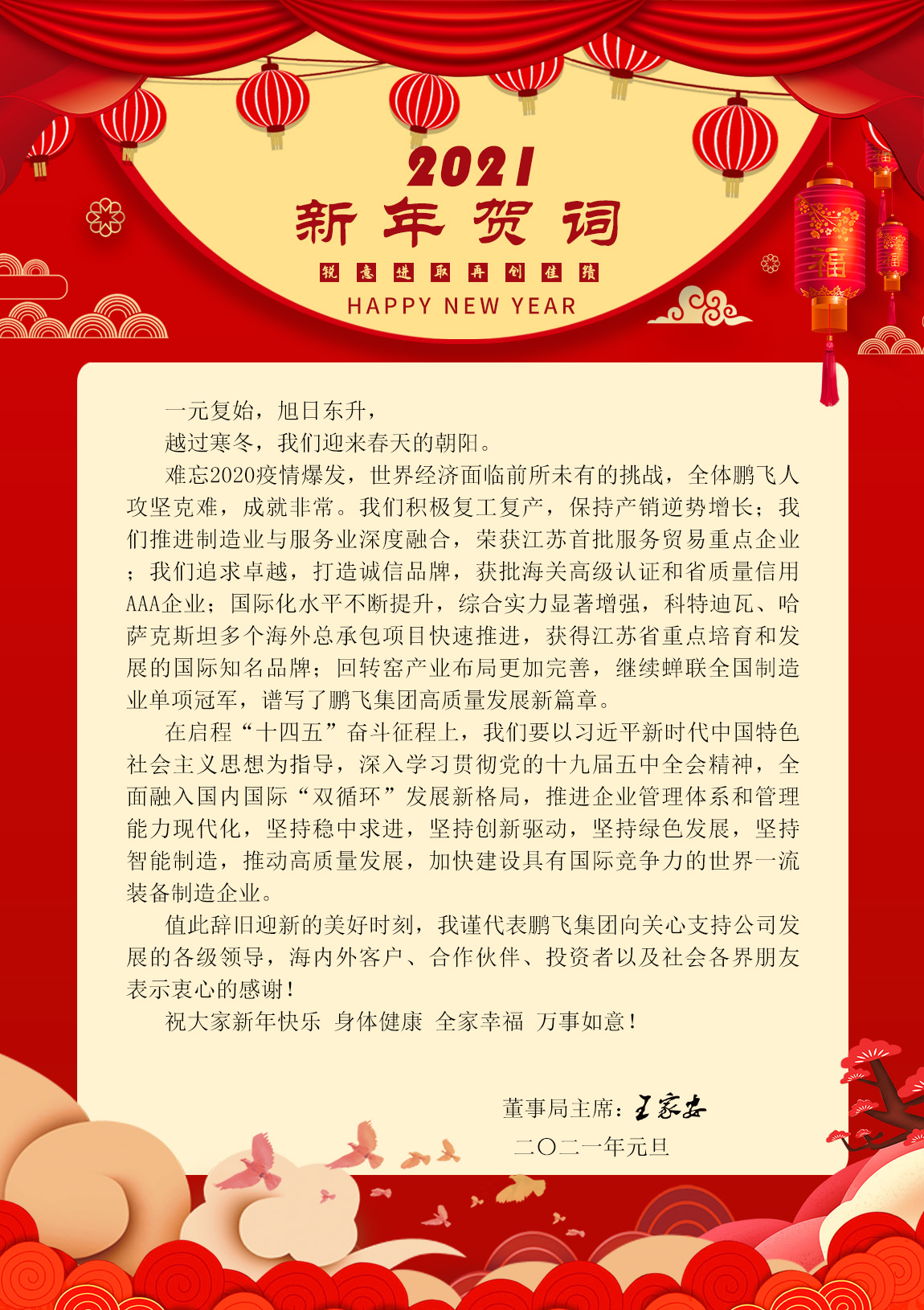 值此辭舊迎新的美好時刻,我謹代表鵬飛集團向關心支持公司發展的各級領導,海內外客戶、合作伙伴、投資者以及社會各界朋友表示衷心的感謝!