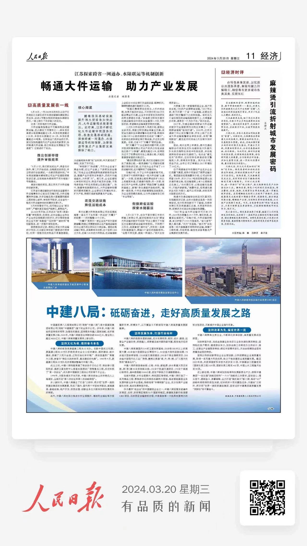 隨著我國基礎(chǔ)設(shè)施提升和大型設(shè)備加快應(yīng)用,大件運輸需求顯著增加。近年來,江蘇不斷優(yōu)化大件運輸審批服務(wù)流程,改造交通基礎(chǔ)設(shè)施,探索跨省一網(wǎng)通辦、水陸聯(lián)運等機制創(chuàng)新,為新能源等重點產(chǎn)業(yè)集群發(fā)展提供了助力。3月18日,一列200米長的車隊從位于江蘇南京江北新區(qū)的中車南京浦鎮(zhèn)車輛有限公司出發(fā),運送6節(jié)橙白相間的地鐵車廂駛往蘇州,一路上吸引了許多路人的目光。這是一次標(biāo)準(zhǔn)的大件運輸。大件運輸是指載運不可解體物品的超限運輸,至少滿足下列情形之一:其車貨總高度從地面算起超過4米、車貨總寬度超過2.55米、車貨總長度超過18.1米、車貨總質(zhì)量超過49噸等。在制造業(yè)門類齊全的江蘇,面對加快構(gòu)建現(xiàn)代化產(chǎn)業(yè)體系的新要求,如何暢通大件運輸、助力制造業(yè)發(fā)展跑出“加速度”?記者進行了走訪。推出創(chuàng)新舉措提升審批效率 “3月17日,我們剛完成生產(chǎn)、具備交付條件,第二天開始運送,當(dāng)晚就運送到位,并立即進行設(shè)備調(diào)試,一點都沒耽誤時間。”中車南京浦鎮(zhèn)車輛有限公司生產(chǎn)經(jīng)理歐明根告訴記者,這批地鐵車廂將用于蘇州地鐵7號線建設(shè)。 高效對接的背后,是江蘇關(guān)于大件運輸?shù)膭?chuàng)新改革。 江蘇省交通運輸綜合行政執(zhí)法監(jiān)督局大件運輸事務(wù)辦公室主任馬梅介紹,大件運輸屬特種運輸,許多運輸品是大國重器和超級工程的核心部件,審批環(huán)節(jié)較多,過去省內(nèi)一般的大件運輸審批時間最快也要3天。 3天時間看似不長,但可能讓企業(yè)“度日如年”,嚴(yán)重時甚至造成產(chǎn)線停工,影響生產(chǎn)。 從2023年開始,江蘇試點“信用+承諾+批量”審批服務(wù);在南京,還對運輸企業(yè)和生產(chǎn)企業(yè)的合規(guī)程度分別評分,評分等級較高的企業(yè)可享“免勘驗”“壓時限”“減材料”等創(chuàng)新服務(wù),進一步提升審批效率。 歐明根告訴記者,得知公司有大件運輸?shù)挠媱澓螅毙聟^(qū)審批部門提前進行預(yù)審批,對同一規(guī)格及批次物品不再重復(fù)勘驗,為運輸?shù)罔F車廂“搶”出時間,半天就完成了審批,發(fā)放了許可證。 “審批按下‘快進鍵’,不僅為企業(yè)省下真金白銀,還讓產(chǎn)業(yè)鏈上下游更加安全穩(wěn)定。”風(fēng)電企業(yè)遠景能源物流部聯(lián)絡(luò)員金煒說,隨著產(chǎn)業(yè)升級和功率提升,風(fēng)機葉片越造越長,大件更“大”。前幾年,企業(yè)還曾擔(dān)心審批時間過長,物品不能及時運輸,于是考慮到客戶所在的西部山區(qū)就近建廠。如今,隨著審批流程的優(yōu)化,大件運輸審批慢的問題得到解決,企業(yè)便在江蘇增加布點、擴大產(chǎn)能,持續(xù)打造新能源重點產(chǎn)業(yè)鏈。 改造交通設(shè)施 降低運輸成本 常州臺廈大件物流有限公司總經(jīng)理武海青一直忘不了去年第一次運送“大罐子”的場景——歷時整整15個小時。 “大罐子”是常州一家企業(yè)生產(chǎn)的大型液氮儲罐,物流公司需要將其從生產(chǎn)基地運輸?shù)郊s35公里外的江陰長江口岸出海。接到這筆運輸訂單后,武海青有點犯愁:這個容積1000立方米、總高7.05米的大件物品,在運輸?shù)缆飞蠒?jīng)過65處紅綠燈及監(jiān)控設(shè)備、路牌標(biāo)識,障礙物最低通行高度僅5.5米。 “輪船已靠港停泊在碼頭,5天內(nèi)將啟程,如果不能及時運出,不僅預(yù)付的300萬元船運費會打水漂,企業(yè)辛辛苦苦攻關(guān)的研發(fā)成果也要砸在手里。”武海青立即向無錫市交通運輸綜合行政執(zhí)法監(jiān)督局二大隊大件組求助,希望解決運輸高度受限的問題。 二大隊大件組負(fù)責(zé)人馮虎介紹,接到企業(yè)訴求后,局里立即協(xié)調(diào)會商拿出方案,決定由交通執(zhí)法車輛或警車在前開道,物流車以每小時5公里的速度在后運送“大罐子”,在其到達前拆卸紅綠燈等設(shè)施,開過后立即復(fù)原。目前,已有9個“大罐子”順利出海。 和“大罐子”個頭過高的問題不同,江陰市恒潤環(huán)鍛有限公司生產(chǎn)的風(fēng)力發(fā)電設(shè)備法蘭是個“小胖墩”,最寬處超過5米,經(jīng)常因為過不了收費站而無法上高速公路,只能經(jīng)普通國省道或水路過江。 “最近收費站改擴建,我們在運輸法蘭時走了高速公路,一路很通暢!”公司副總經(jīng)理潘云剛告訴記者,這不但為企業(yè)節(jié)省了1/5的運輸時間,還大幅降低了運輸成本。 馬梅介紹,為了讓大件運輸有路可走,江蘇將于今明兩年建設(shè)一批大件運輸“主通道”:一方面,在高速公路收費站改擴5米以上的超寬車道,打通通行瓶頸;另一方面,結(jié)合江蘇產(chǎn)業(yè)布局,在原有“兩縱四橫”主通道的基礎(chǔ)上,新增7條主通道并連線成網(wǎng)。值得一提的是,今年還將新增智能選線服務(wù),為企業(yè)規(guī)劃最優(yōu)路線,讓大件運輸有自己的“專業(yè)導(dǎo)航”。 銜接跨省運輸 探索水陸聯(lián)運 3月5日下午,在位于泰州靖江市的大明重工有限公司,副總經(jīng)理吳興生在“跨省大件運輸并聯(lián)許可系統(tǒng)”平臺上提交了大型壓力容器的跨省運輸申報資料。不到兩個工作日,他就拿到“通行證”,并收到一條泰州到