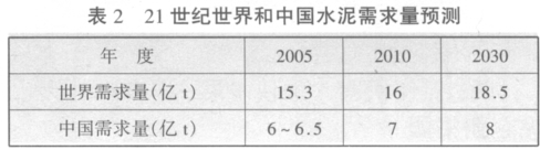 21世紀(jì)世界和我國(guó)水泥的生產(chǎn)與消費(fèi)仍將保持一定速度增長(zhǎng),但不是很高。表 2 是世界和中國(guó)水泥需求量的預(yù)測(cè)。