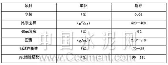 國內由天津院研制開發的第一臺礦渣磨TRM3131S,用于杭州紫恒公司制備礦渣微粉,配用高效籠式選粉機,成品細度可在400~600m2/kg范圍內靈活調節,當控制礦渣微粉比表面積450m2/kg時,立磨臺時產量達52t/h,系統電耗為37.3kWh/t,制備的礦渣微粉性能見表8: