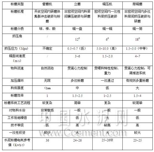 表1   管磨機與立磨、輥壓機、筒輥磨粉磨特性對比