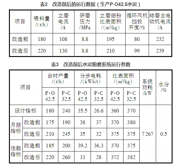 通過以上幾個方面的整改,水泥粉磨系統的臺時產量有了明顯提升,表2是改造前后的運行數據,表3是水泥粉磨系統改造前后操作參數對照。