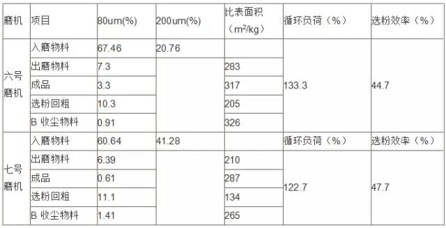2、同時對六七號磨機的入磨物料、出磨物料、選粉機回粗、B收塵的物料、水泥成品、在磨機運轉正常的情況下進行取樣,做80um、200um、及比表面積以計算磨機的循環負荷和選粉機的選粉效率。測量結果見下表:
