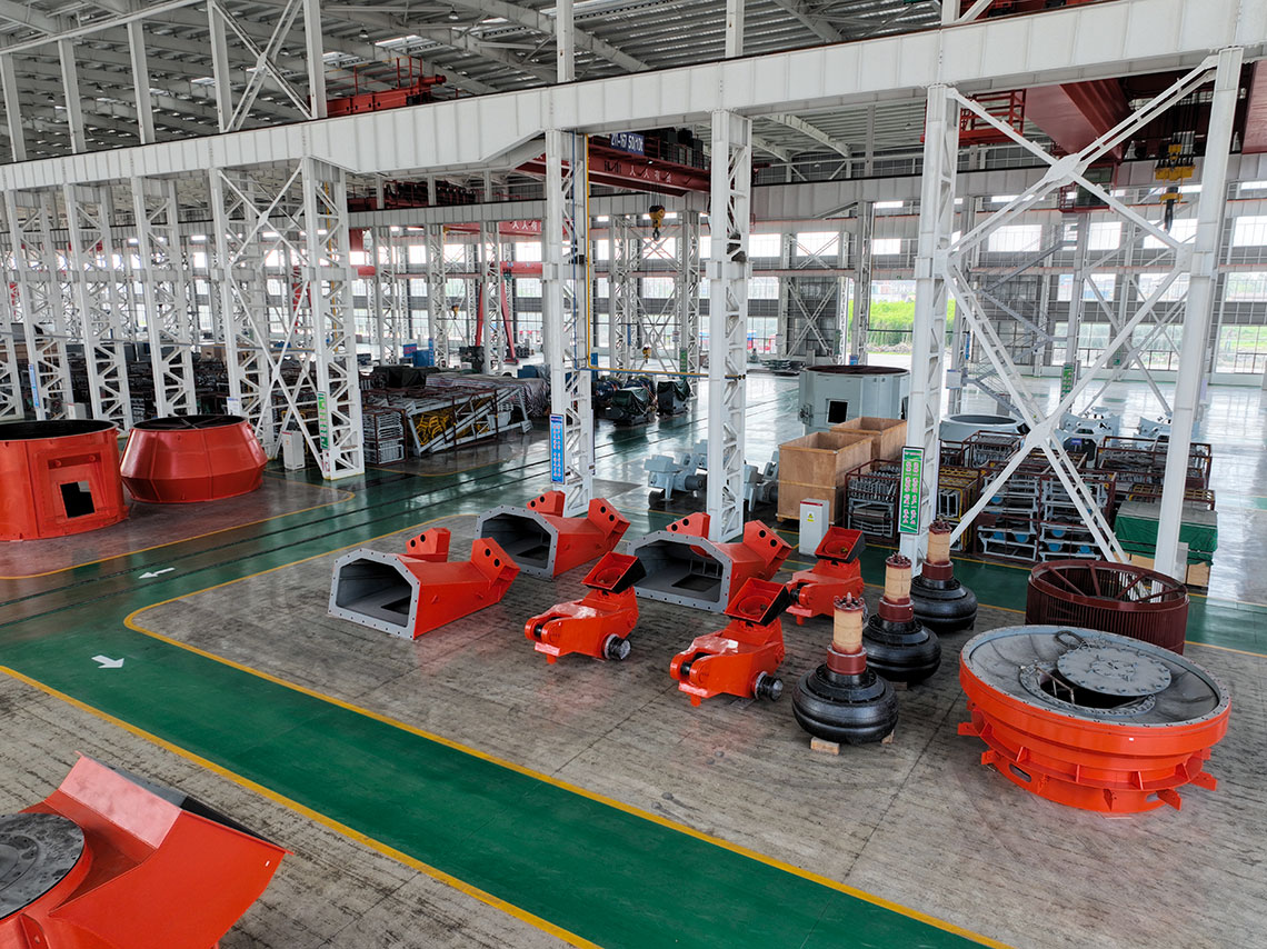 磨煤機三個磨輥由旋轉的磨盤帶動進行碾磨作業。入磨物料經中心落煤管落在磨盤上后,由旋轉磨盤產生的離心力將其輸送至碾磨輥道上碾磨。碾磨壓力由彈簧或液壓加壓裝置產生,通過靜定的三點系統,碾磨力均勻地傳至三個磨輥,通過加壓系統壓力傳至基礎。煤粉的干燥和輸送利用熱風來進行。熱風通過噴嘴環均勻分布于磨盤四周,將經碾磨的物料干燥并輸送至磨機上部的分離器。物料的粗細粉在此分離,細粉排出磨機,粗粉重新返回磨內碾磨。物料中的一些不可破碎物可通過磨機下部的排碴口排出。磨煤機主要由基礎部,減速機,下架機,中架機,磨盤,磨輥,加壓裝置,分離器,正壓風密封裝置,蒸汽吹掃裝置等部件組成,還配有主電動機,潤滑油站,液壓站和密封風機等附屬設備,另備有慢速傳動裝置,安裝檢修專用工具,扶梯平臺,煤粉分配器,速斷閥等配套設備供用戶選用。磨煤機采用液壓加壓系統,在運行中即可對粉磨壓力進行調整,并具有更好的過鐵保護性能。在原標準型的基礎上增加了磨輥翻出裝置,并提高了磨體的抗爆能力。